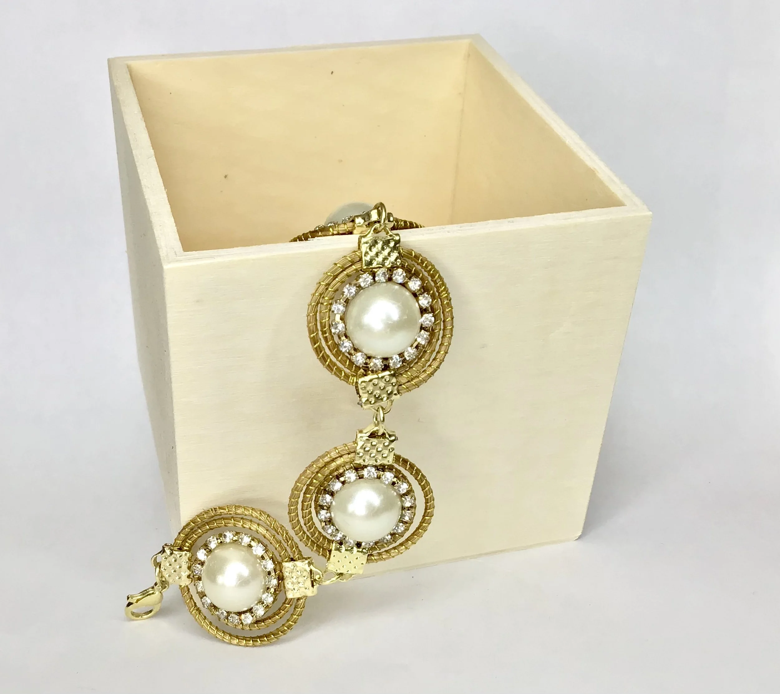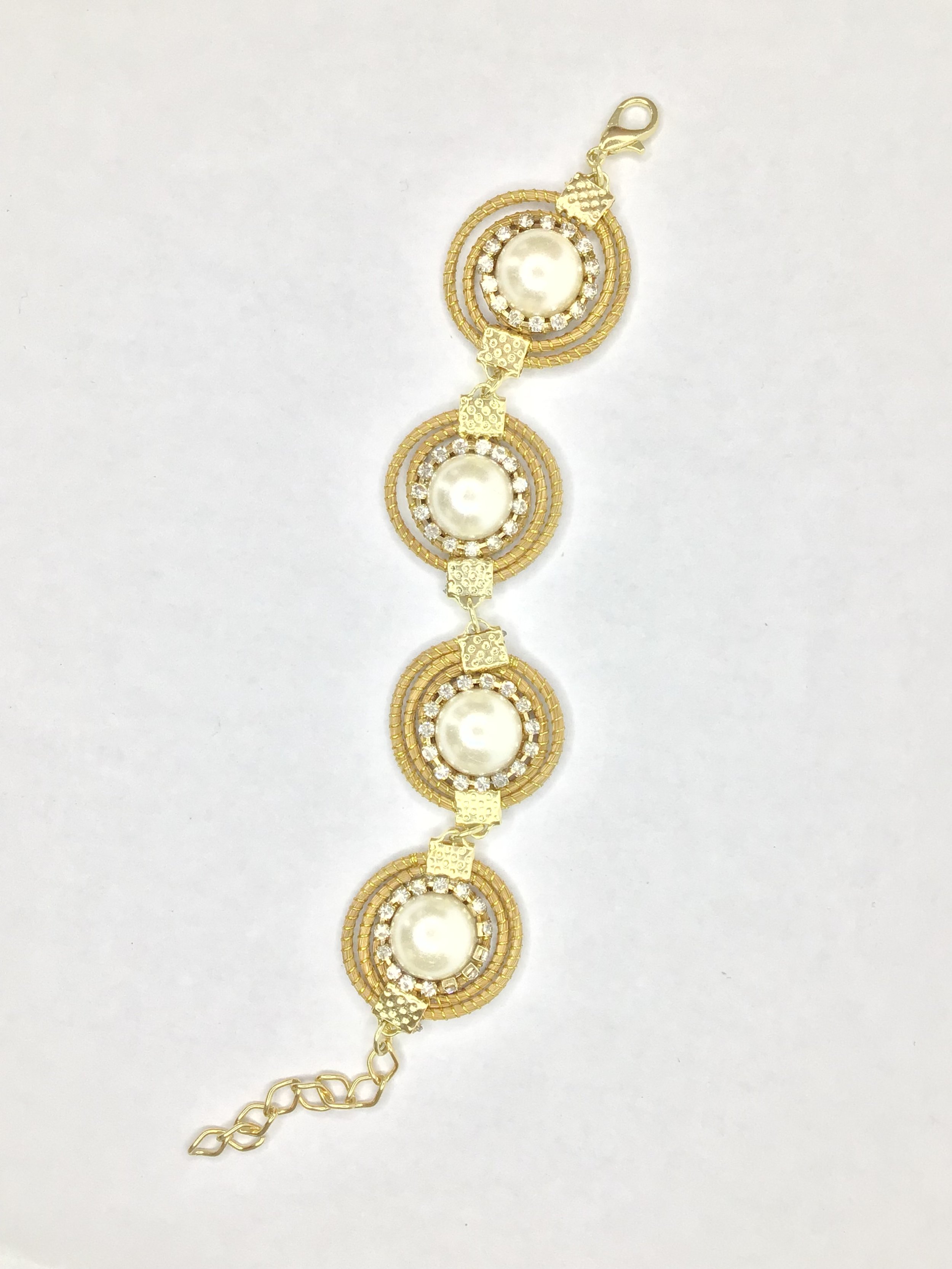 A design of woven circular motifs interconnected with 18k gold-plated clasps. Each circle has a pearl at its center. Surrounding each pearl is a cluster of crystals, adding a touch of sparkle .