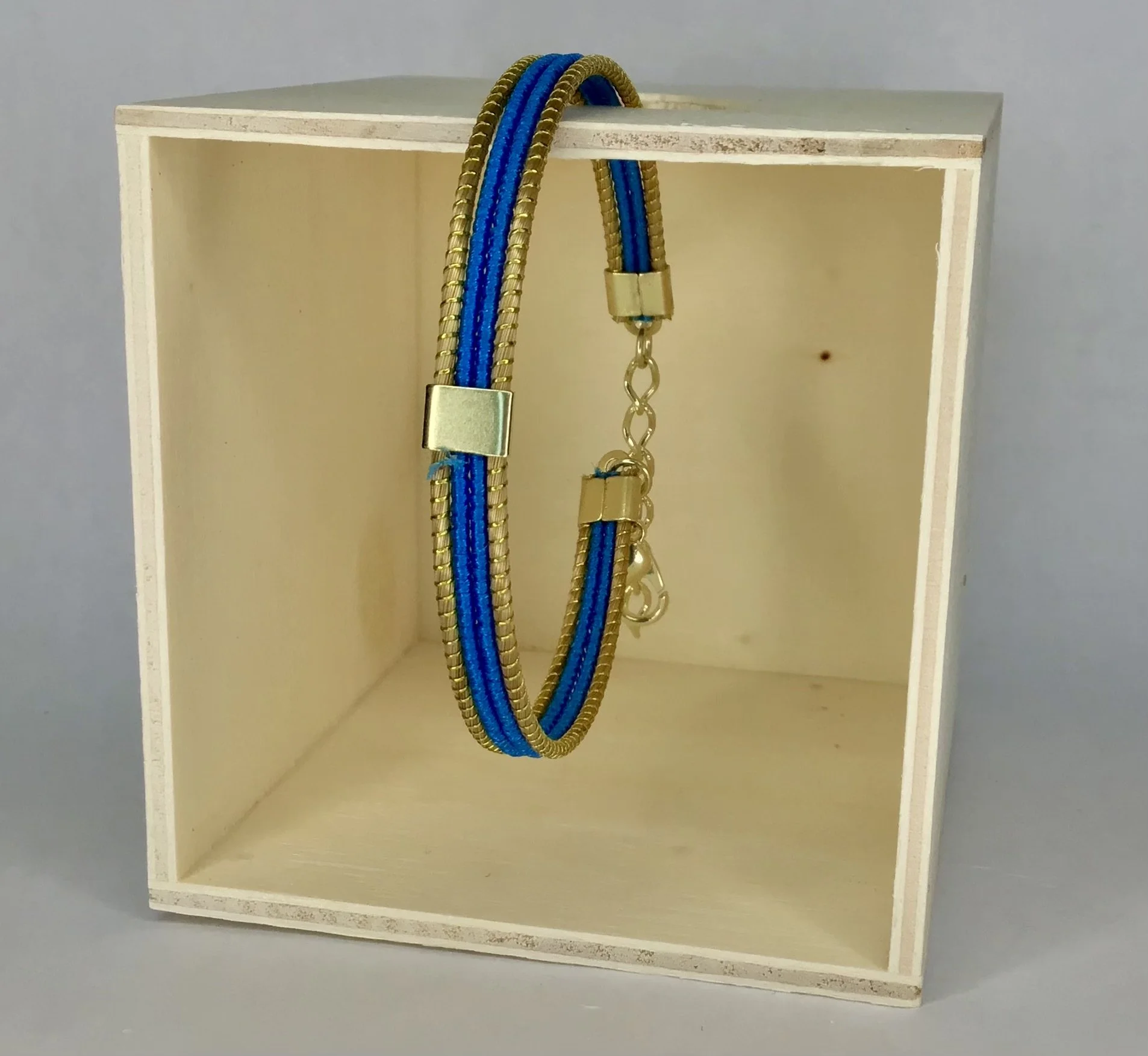 A sleek bracelet design with a combination of blue and metallic gold stands. The blue cord runs in between bands of golden grass, held together by a small 18k gold-plated clasp.
